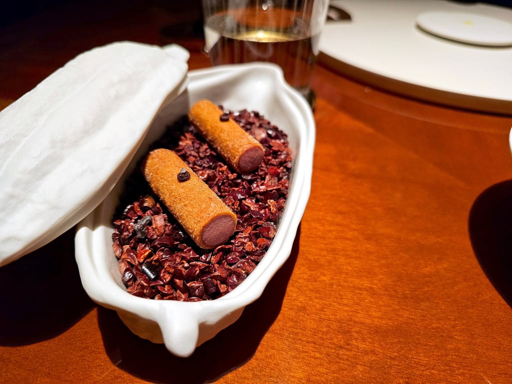 Then came a selection of 4 different bite-sized appetizers. First was a sake-cured kanpachi (amberjack), which was delicately dressed. This was followed by locally-sourced garden greens, which had been carefully placed into a pillow-shaped, very light flaky crouton pastry of sorts. Next was a cube of fried potato (think an elegant tater tot), topped neatly with thin slices of Spanish anchovies. Dots of Meyer lemon jam and wild arugula puree topped the fish and added color as well as an acidic edge of flavor to cut through the primary salty and savory flavors. Finally for the dessert of this micro-meal, there were stuffed churros topped with chocolate. However, these were not the churros one would find at the Del Mar Fair down the street. The stuffing was a chicken liver mousse, and the tiniest dot of chocolate on the top was a bitter dark chocolate. These, as well as the rest of the appetizers in the course, were absolutely delicious. Who would’ve thought?