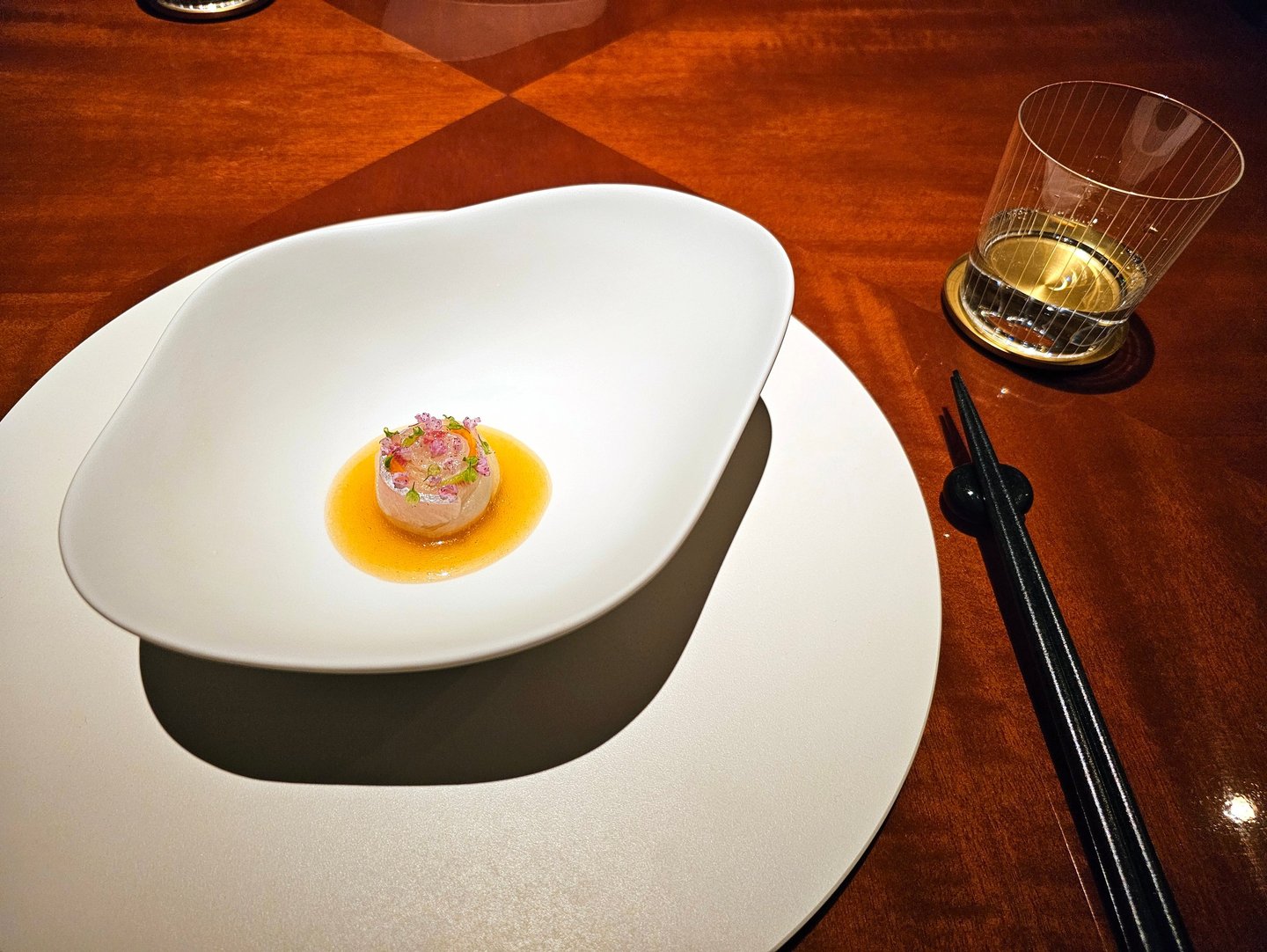 The next dish on the menu is known as “Eggs and Rice,” however the name is mildly misleading. It is composed of toasted Koshihikari rice (a common variety of Japanese rice) and sesame, all brought together in a creamy smoked sabayon, which is an egg yolk-based sauce. This is topped with a generous dollop of Regiis Ova caviar, which is the brand owned by chef Thomas Keller of The French Laundry. In my completely subjective opinion, this is my favorite dish from any restaurant I have ever tried. Obviously, the ingredients are terrific on their own, but something about the flavors of the dish strikes a chord with me. It almost hits a nostalgic note and takes me back to a fond childhood memory of my grandparent’s home, enjoying a familiar warmth on a cold winter night. Anyway, the dish is simple in its ingredients, yet complex in its flavors, which are incredibly deep, savory, and rich. The amount is enough to satisfy (although I would eat several servings) but not too much to fill up, since there are several more courses to go.