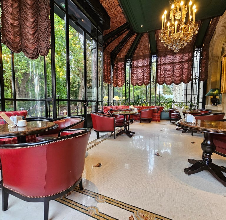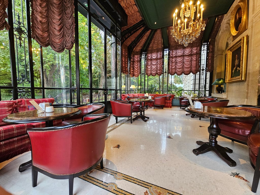 As we pulled up to the hotel, we were quickly greeted by the valets who helped with our luggage and took the car away. Just past the front door, inside the foyer, was the front desk tucked off to one side. Once we were checked in, we were led to the bar, La Rotonde, to enjoy a complimentary glass of champagne. The bar itself was simple but elegant, with rich dark wood, surrounded by walls painted a deep green, almost black in the low lighting. Traditional tartan plaid adorned the rest of the room, from the upholstery on armchairs, to the curtains, even to the carpet, but it was far from being noisy, as my description may evoke. Cozy is the word I would choose, and cozy this room certainly was. We were seated in an adjoining room, which was quite the contrast from the predominantly dark bar, but it still carried the same tones and general theme. Instead of dark walls, however, this room was almost like a conservatory, with floor to ceiling windows on three sides overlooking the park, light colored stone comprising the last wall, then white mosaic tile which covered the floor. My one regret after staying here was that I was not able to spend more time in La Rotonde. This was my favorite part of the property, aside from the park, and I could have spent hours here, sampling some of the thousands of wines on their list, nibbling on decadent small plates, and enjoying top-shelf spirits. I would have had trouble making it back to the room.