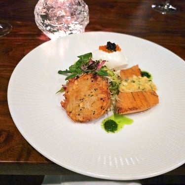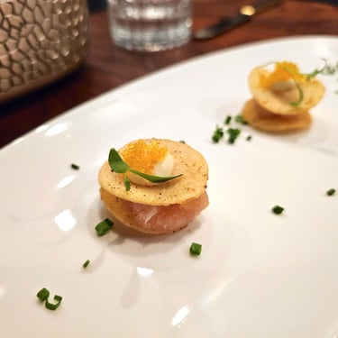 Like last time, the meal began with some fresh bread sent out from the kitchen, as well as a little amuse bouche. The bread selection remained consistent, featuring a couple slices of sourdough, and a couple small cornbread muffins. Different was the amuse bouche, which this time featured chopped tuna sashimi between thin, crisp chips, topped with a small dollop of cream and golden caviar. These bites were fresh, clean, and delicious, and were a very pleasant intro to the meal.