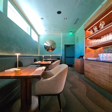 Providence is situated right along Melrose Avenue, which isn’t the busiest street in LA, but a local thoroughfare nonetheless. Fortunately, there is a decent amount of street parking in the adjacent neighborhood, as well as a dedicated valet service out front. The building itself has a stylish sort of modern-organic aesthetic to it on the outside, which has remained relatively the same design since the restaurant’s opening. This theme is carried through to the inside as well, with a deep sea-green being the main theme chromatically, contrasted by natural accents of wood found throughout the space, such as the tables and cabinets. The whole restaurant occupies a relatively small space, but the design made the space feel elegant and comfortable.