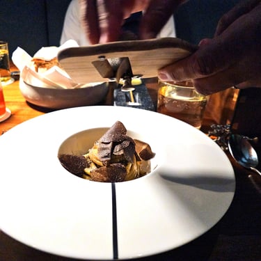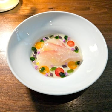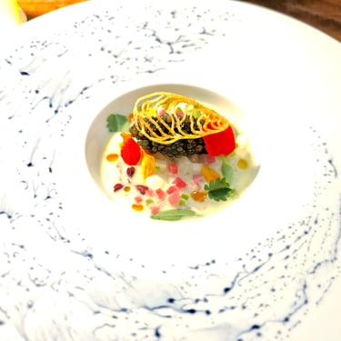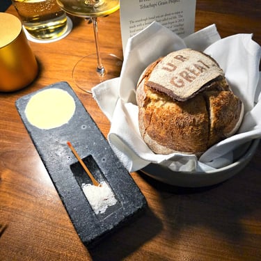 Among these leading dishes were a couple supplemental items, including Providence's well-known ‘uni egg’, as well as a delicious chitarra pasta with added Australian black truffle. Also added to our menu as a surprise item was a tiny bite-sized lobster roll, with about as much shredded black truffle on top as there was lobster roll. About halfway through this series of dishes before the main course, bread was served, which was a hearty sourdough made with Red Fife grains sourced from Tehachapi Grain Project. The bread was served with a delicious French butter from Normandy, as well as salt, which we did not need, since the bread itself had plenty of flavor.