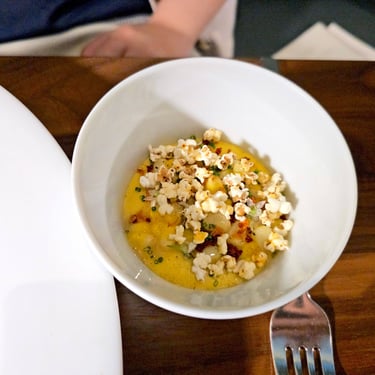 For the main courses, we opted to try the king salmon and also the wagyu, which was a supplemental upgrade. Both dishes, like the rest of the meal, were perfectly prepared, neatly plated, and full of flavor. The wagyu was accompanied by a side of creamy Brentwood corn, grown locally in central California, topped with popped sorghum, like miniature popcorn.