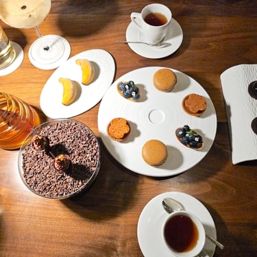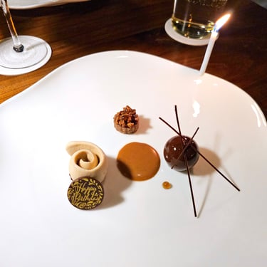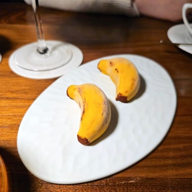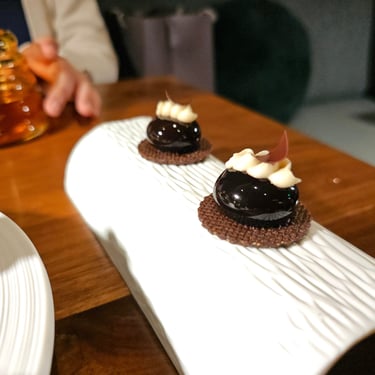 Finally, dessert. Providence’s dessert consisted of another collection of small bites, primarily featuring chocolate that has been developed and prepared in-house by pastry chef Mac Daniel Dimla. During the pandemic when most people learned to make sourdough, chef Dimla learned the art of chocolate. An impressive array of preparations was set before us, including milk chocolate, macarons, mousse, and even mirror-glazed bon bons. We were even the first ones to try one of chef Dimla’s new creations that looked like a tiny banana but was filled with a rum raisin ice cream, which I really enjoyed, personally. A small cup of warm tea was served alongside the dessert spread, but what paired really well with all of the chocolate flavors was an espresso martini.